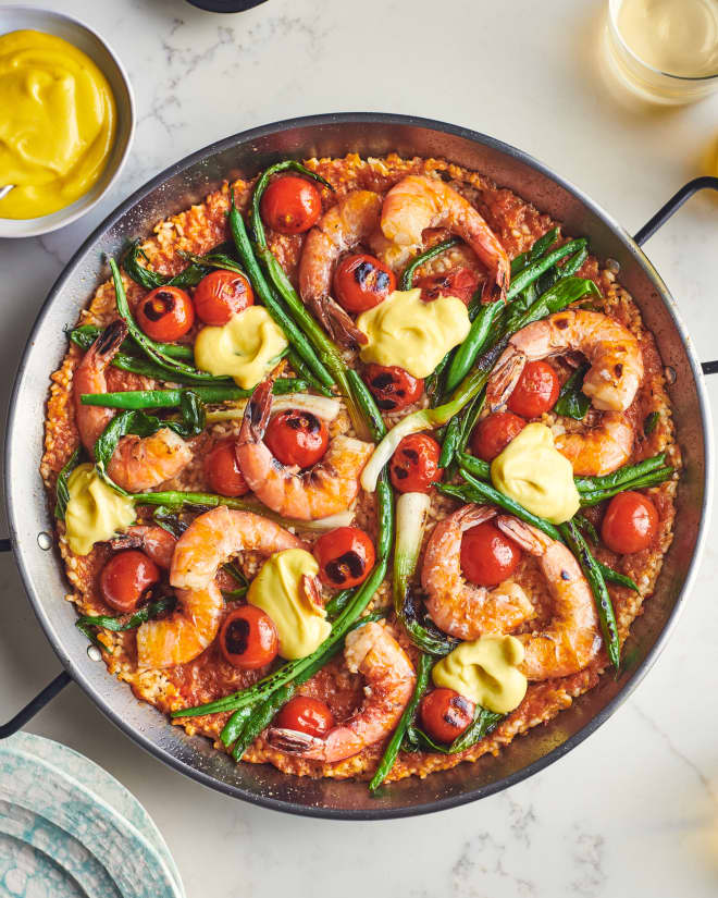 This vibrant Spanish rice dish, which uses the same technique as paella, is loaded with fresh veggies and shrimp and topped with garlicky all i oli.