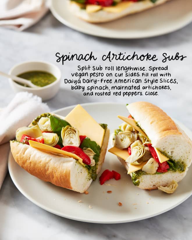 These fast and fancy sub sandwiches are currently our favorite no-cook summer meal. How can you go wrong with a mix of herby pesto, marinated artichokes, roasted red peppers, and baby spinach? What really makes these sandwiches sing are Daiya Dairy-Free American Style Slices. The slices deliver so much creamy, rich flavor, you’ll be sure to make these subs on repeat all season long.