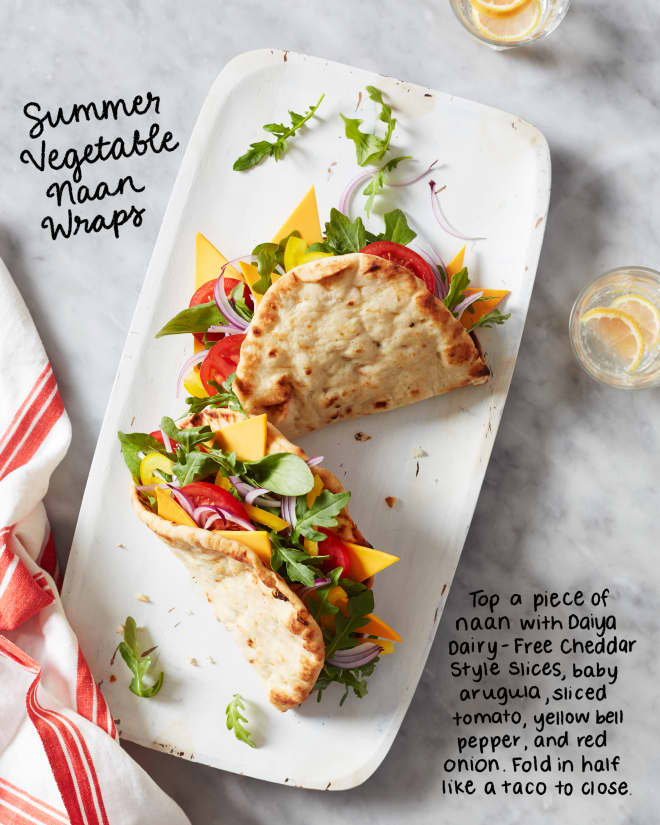 Summertime dishes are filled with vibrant colors, and we think that’s worth celebrating. Sweet tomatoes, juicy bell peppers, crisp red onion, and peppery arugula come together in a rainbow of flavor and texture in these vibrant naan wraps. The one thing that makes them extra special? Daiya Dairy-Free Cheddar Style Slices. The slices are so pleasantly sharp and smooth, you won’t believe they’re plant-based.